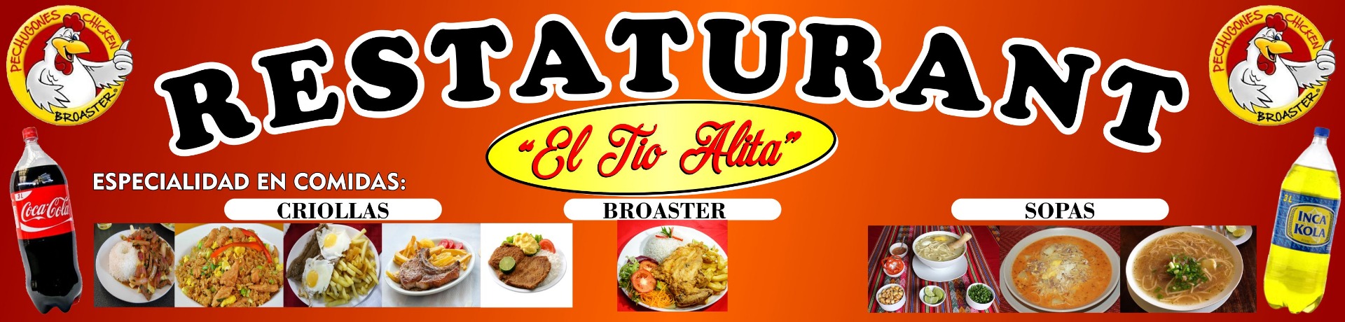 Especialidad en comida criolla, broaster, sopas